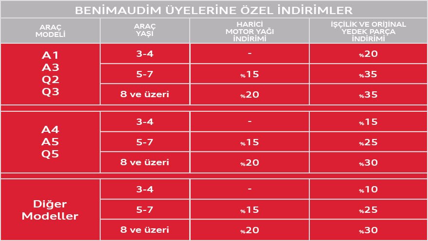 3 yaş ve üzeri Audi’niz için mekanik işçilik hizmetlerinde, Castrol yağlarda, araç lastiklerinde ve Audi Orijinal Parçalarında Benimaudim Segment İndirimi ayrıcalıkları Audi Yetkili Servislerinde sizi bekliyor.